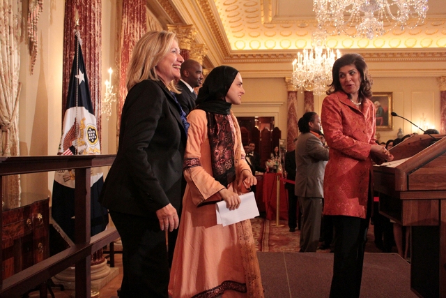 | Kulsoom with Sec. Clinton (L) and Farah Pandith (R) |